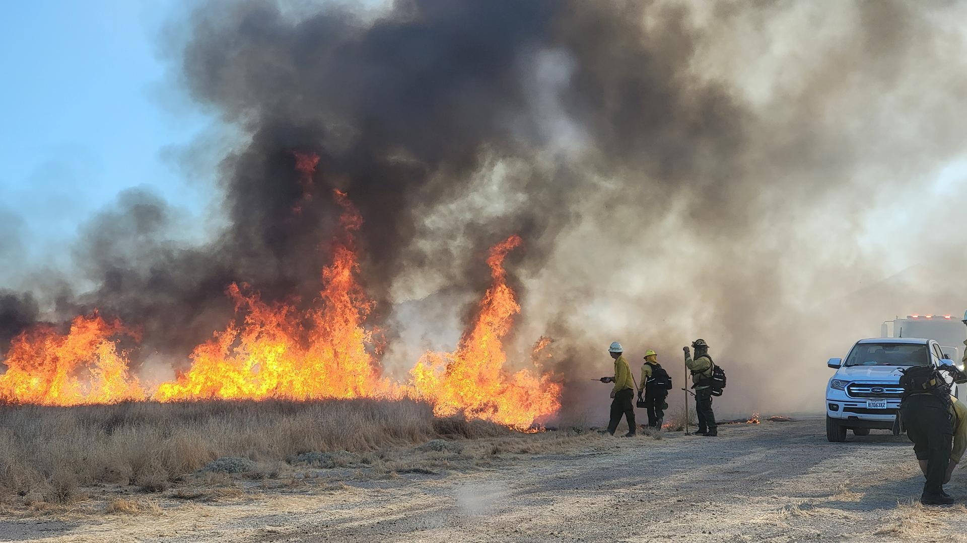 SLO TREX students and instructor observe the flames as the controlled fire moves through a section of grassland |