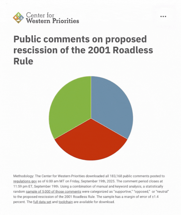 The Center for Western Priorities early analysis of the submitted comments found that an overwhelming 99% of the comments supported keeping the Roadless Rule in place. That is a staggering number of public lands protectors who are standing up against the onslaught coming from this administration. Your voice matters and we have data to prove it. We've done our part by showing that people overwhelmingly support protecting public lands. Now it's up to this administration to decide whether they'll follow through on what the public has clearly called for. A final decision is expected in late 2026. |