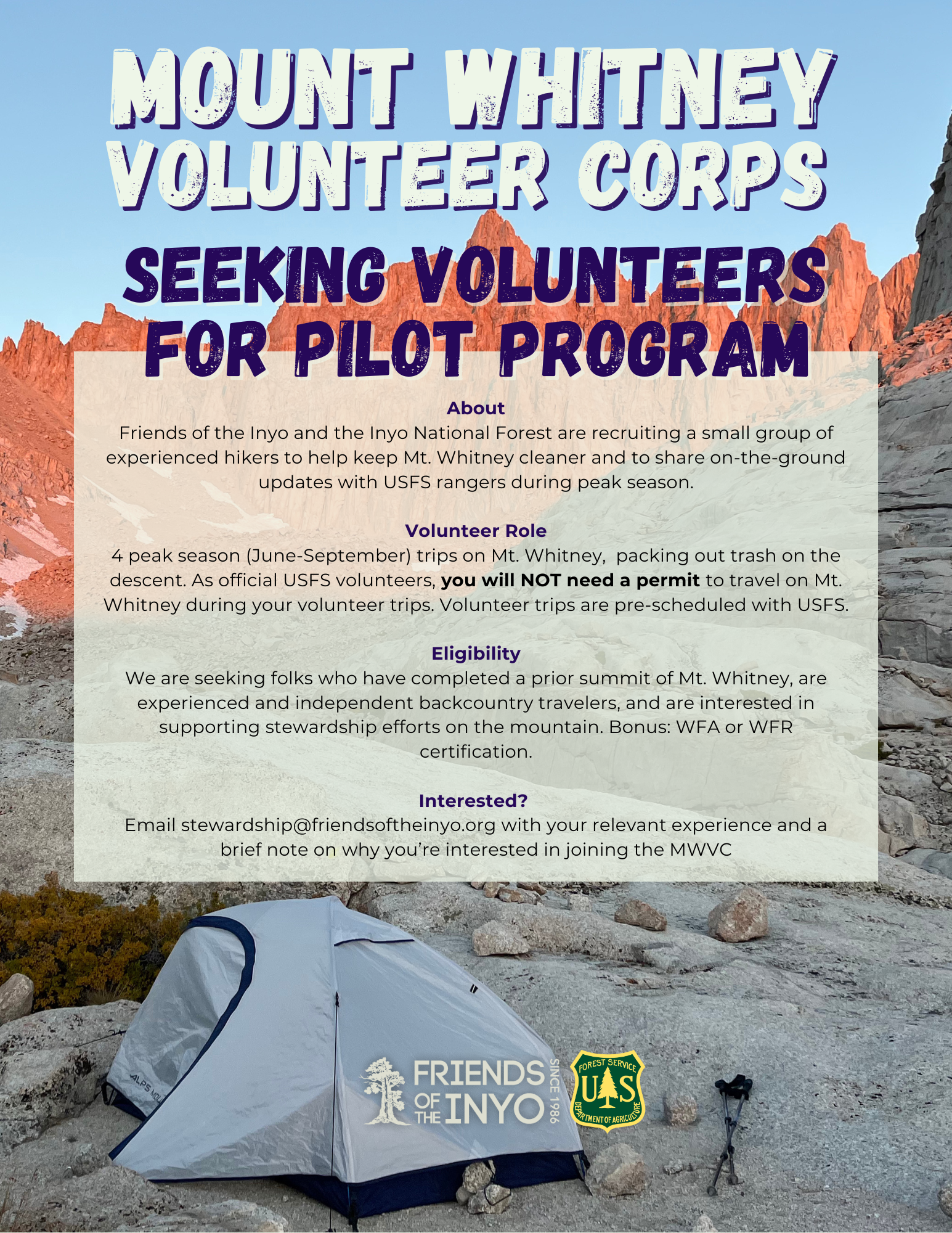 Interested in applying? Email stewardship@friendsoftheinyo.org with: - Your relevant experience - A short note on why you’re interested in joining the Mount Whitney Volunteer Corps |