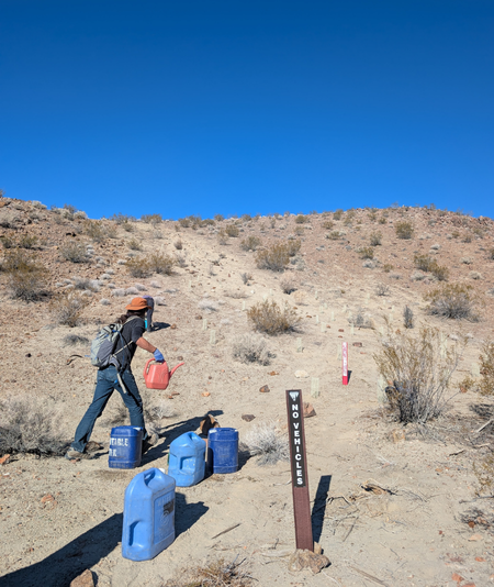 With the help of 8 volunteers, 2 BLM Park Rangers, and 1 Friends of the Inyo staff member, the team restored 6,000 square feet of user-created route using vertical mulching, native planting, and strategic rock placement. Restoration included planting 40 native winterfat and burrobrush to help discourage off-route travel and support long-term success of the naturalization efforts.