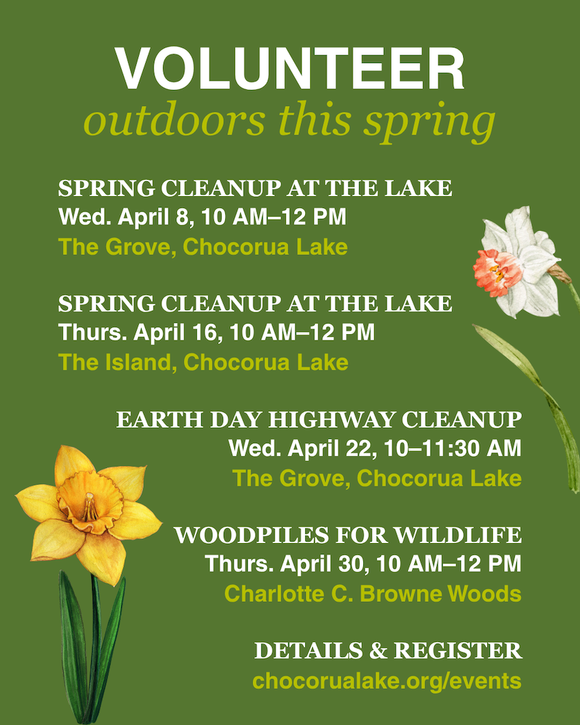 Outdoor Volunteer Morning, Thurs. April 16, 10 AM–12 PM. Winter cleanup and spreading wood chips, meet at the Island, Chocorua Lake. Info and register HERE.