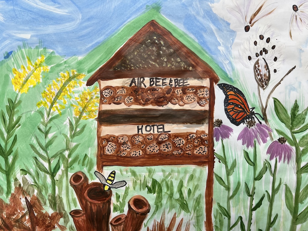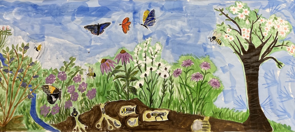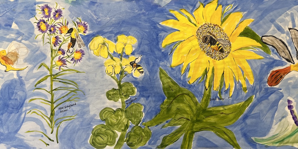 Small actions make a huge difference to pollinators. Because ground-nesting native bees have a relatively small range, providing stopover locations like a few flowering plants on a patio or a wildflower garden between an urban sidewalk and road can help increase pollinator populations. Or, offering nesting habitat to certain species by making your own Air Bee & Bee! | Pollinators & Plants crankie artists