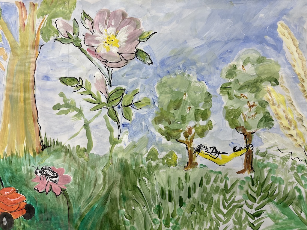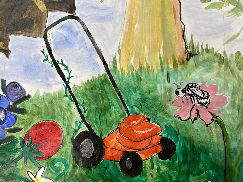 One way you can help pollinators is by practicing No Mow May (or No Mow May and June, in our neck of the woods) or mosaic mowing, leaving sections of the lawn to grow and flower. While your mower sits idle, enjoy a quiet moment in the hammock. | Pollinators & Plants crankie artists