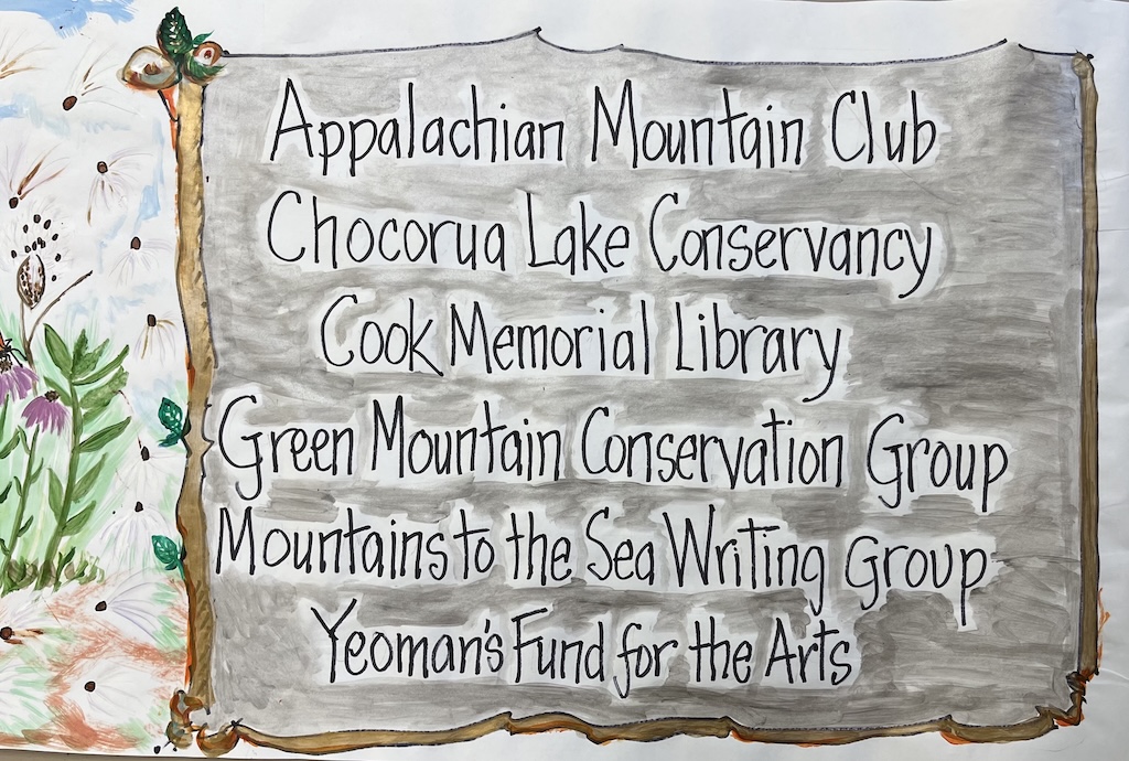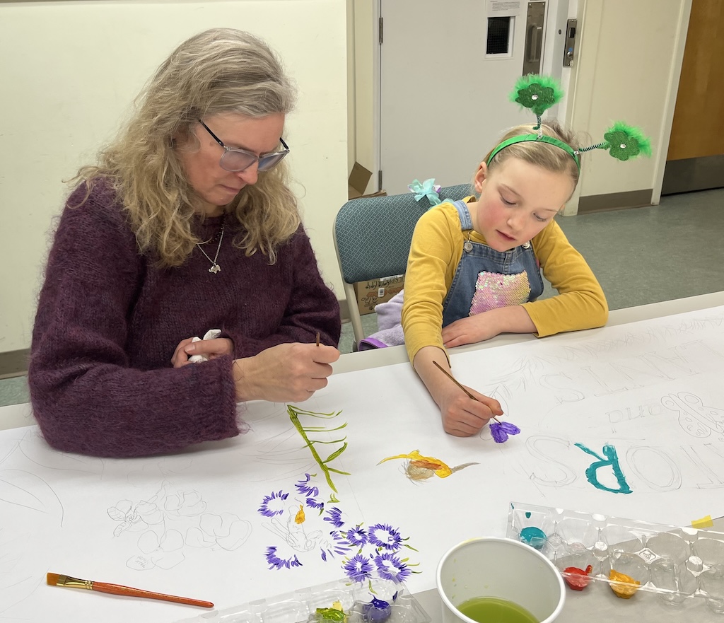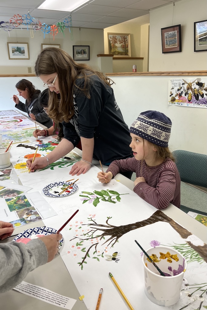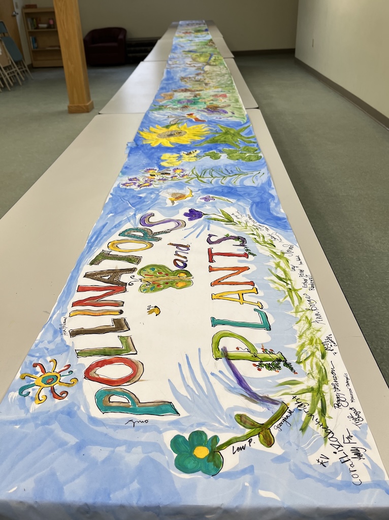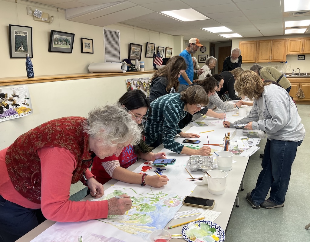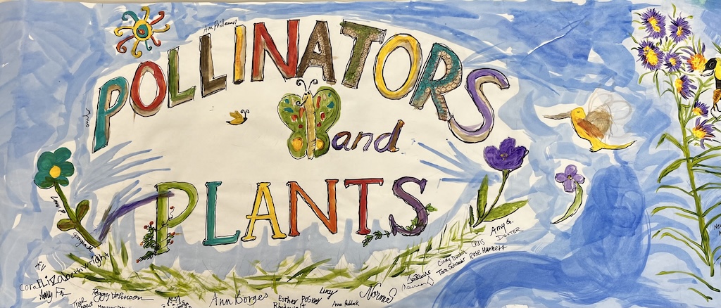 In anticipation of the emerging crawling, buzzing, flying insects, an amazing crew of nearly 30 local artists ranging from childhood to elderhood gathered to paint an extraordinarily beautiful Pollinators & Plants crankie, full of color, sunshine, blue skies, and stunning, detailed images of native plants and pollinators. Enjoy a sneak peek below, with a few suggestions for ways you can help pollinators (e.g. by relaxing in a hammock!), and come see the crankie performed live at Cook Library on Friday, May 22, at 3:30 PM.