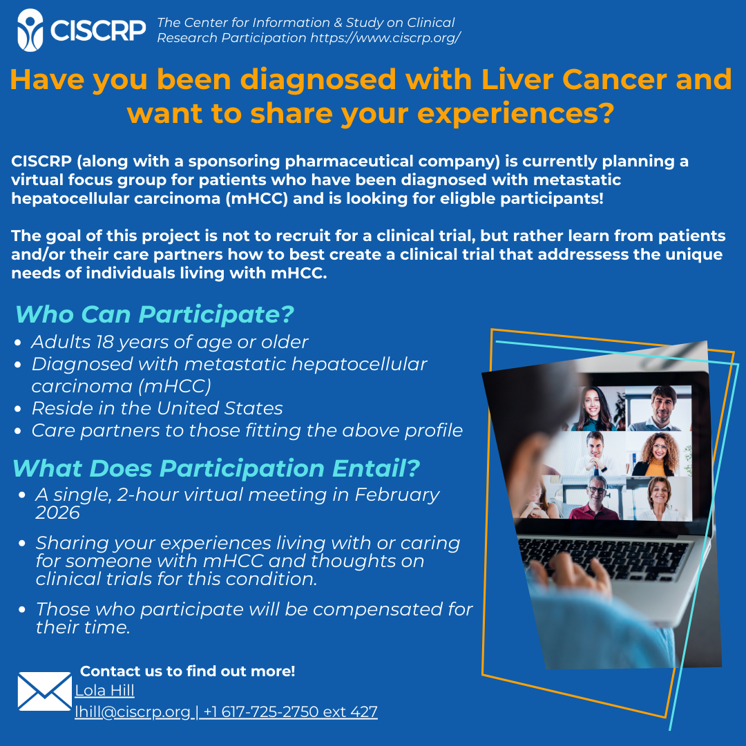 The Center for Information and Study on Clinical Research Participation (CISCRP), together with a pharmaceutical company, is planning a virtual focus group with adults diagnosed with metastatic hepatocellular carcinoma (mHCC) and/or their care partners to discuss their experiences, share general thoughts on clinical research, and provide feedback on a proposed clinical study evaluating a new treatment for mHCC.